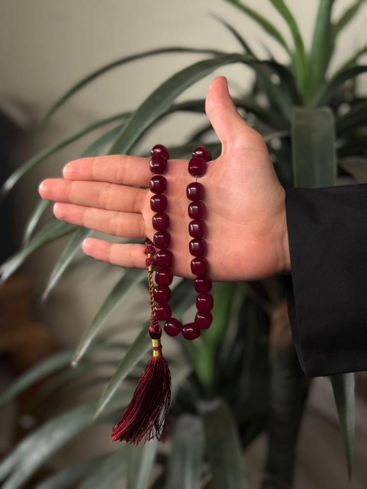 سبحة راقية مصنوعة من الفاتوران الأصلي، بلون عنابي فاخر يضفي لمسة من الفخامة والجمال.